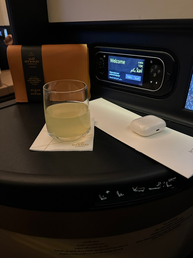 At my seat there was already an amenity kit by Aqua Di Parma, a menu and wine card, as well as Armani Casa products: A blanket, pillow and even a mattress topper, which comes in very handy for sleeping!