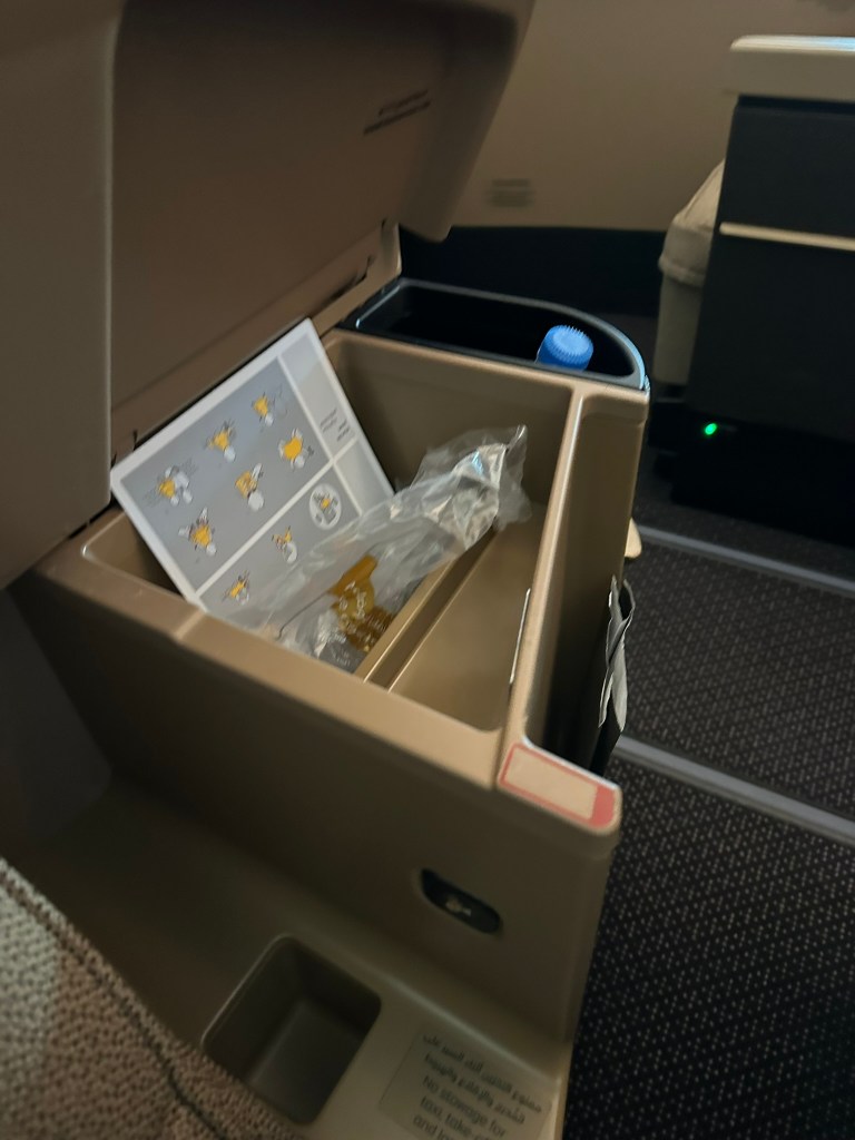 Mid-flight you could only leave personal items like a backpack in the foot-rest or on the ground, which wasn´t an option for me. Putting the essentials in this storage compartment next to the armrest was therefore very useful.