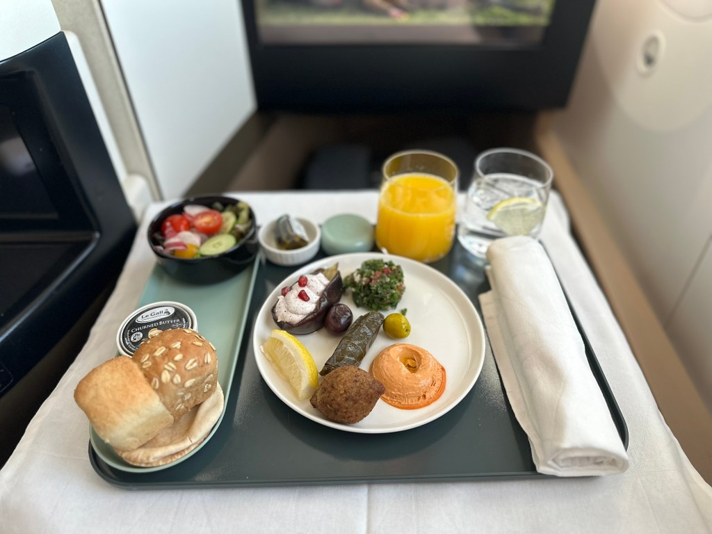 As a starter, I chose the classic Arabic Mezze which Etihad does well. Comparing the overall taste of it to Qatar Airways Business Class service and their Arabic Mezze though, this lacks in freshness.
